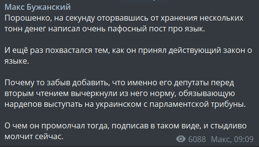 "Порошенко, на секунду оторвавшись от хранения нескольких тонн денег написал очень пафосный пост про язык.