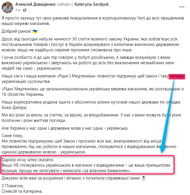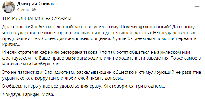"Драконовский и бессмысленный закон вступил в силу. Почему драконовский? Да потому, что государство не имеет право вмешиваться в деятельность частных НЕгосударственных предприятий. Тем более, диктовать язык общения. Лучше бы деньгами помогли пережить кризис...