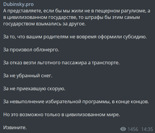 "А представляете, если бы мы жили не в пещерном рагулизме, а в цивилизованном государстве, то штрафы бы этим самым государством взымались за другое.