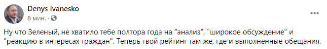 "Ну что, Зеленый, не хватило тебе полтора года на "анализ", "широкое обсуждение" и "реакцию в интересах граждан". Теперь твой рейтинг там же, где и выполненные обещания", - пишет Иванеско.