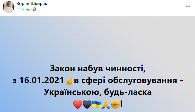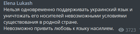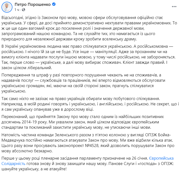 "Сегодня вступили в силу положения языкового закона, открывающие новый виток дискриминации русского языка и языков национальных меньшинств. Вводятся новые ограничения и штрафы за использование родного для миллионов украинцев языка в сфере услуг.