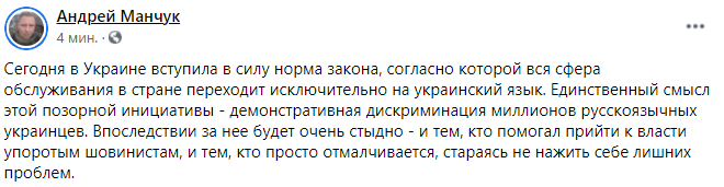 "Сегодня в Украине вступила в силу норма закона, согласно которой вся сфера обслуживания в стране переходит исключительно на украинский язык. Единственный смысл этой позорной инициативы - демонстративная дискриминация миллионов русскоязычных украинцев. Впоследствии за нее будет очень стыдно - и тем, кто помогал прийти к власти упоротым шовинистам, и тем, кто просто отмалчивается, стараясь не нажить себе лишних проблем", - пишет журналист Андрей Манчук.