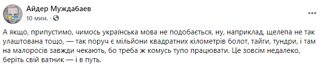 "Если, допустим, чем украинский язык не нравится, ну, например, челюсть не так устроена т.д., - так рядом есть миллионы квадратных километров болот, тайги, тундры, и там малороссов всегда ждут, ведь надо же кому-то тупо работать. Это совсем недалеко, берите свой ватник - и в путь", - предложил он.