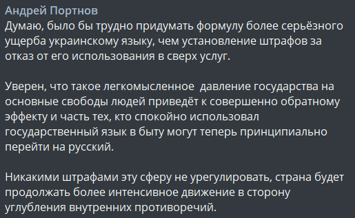 "Думаю, было бы трудно придумать формулу более серьёзного ущерба украинскому языку, чем установление штрафов за отказ от его использования в сверх услуг.