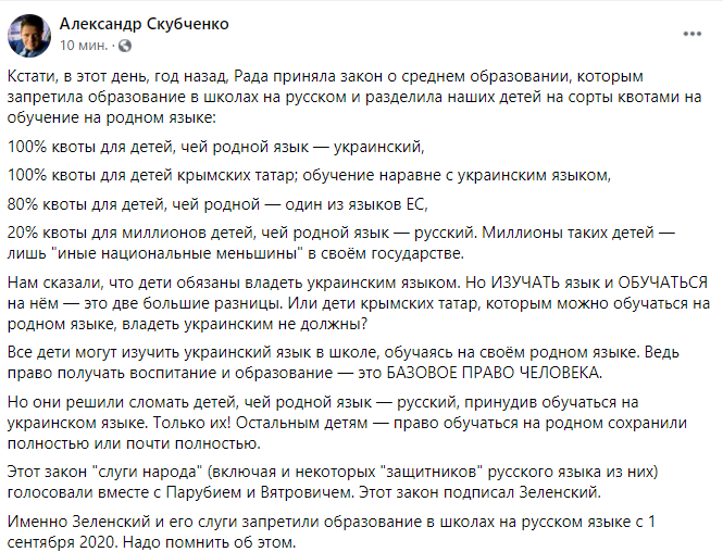 Кстати, в этот день, год назад, Рада приняла закон о среднем образовании, которым запретила образование в школах на русском и разделила наших детей на сорты квотами на обучение на родном языке: