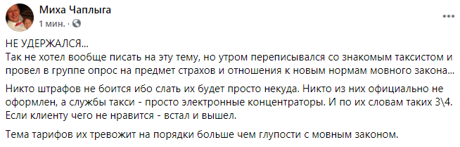 "Утром переписывался со знакомым таксистом и провел в группе опрос на предмет страхов и отношения к новым нормам мовного закона.