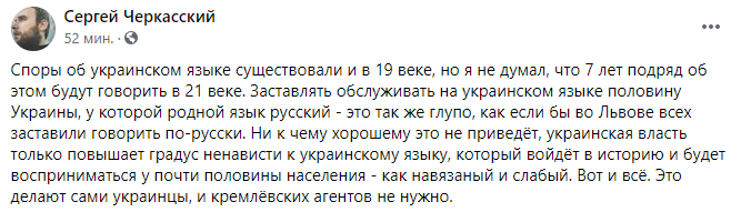 "Споры об украинском языке существовали и в 19 веке, но я не думал, что 7 лет подряд об этом будут говорить в 21 веке. Заставлять обслуживать на украинском языке половину Украины, у которой родной язык русский - это так же глупо, как если бы во Львове всех заставили говорить по-русски. Ни к чему хорошему это не приведёт, украинская власть только повышает градус ненависти к украинскому языку, который войдёт в историю и будет восприниматься у почти половины населения - как навязанный и слабый. Вот и всё. Это делают сами украинцы, и кремлёвских агентов не нужно".