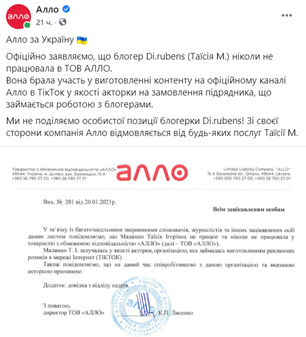 "Официально заявляем, что блогер Di.rubens (Таисия М.) никогда не работала в ООО "Алло". Она участвовала в изготовлении контента на официальном канале "Алло" в ТикТок в качестве актрисы на заказ подрядчика, занимающегося работой с блогерами. Мы не разделяем личной позиции блогера Di.rubens! Со своей стороны компания "Алло" отказывается от каких-либо услуг Таисии М.", - заявили в компании.