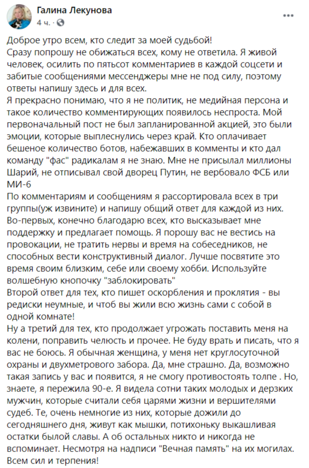 "Для тех, кто продолжает угрожать поставить меня на колени, поправить челюсть и прочее. Не буду врать и писать, что я вас не боюсь. Я обычная женщина, у меня нет круглосуточной охраны и двухметрового забора. Да, мне страшно. Да, возможно, такая запись у вас и появится, я не смогу противостоять толпе. Но, знаете, я пережила 90-е. Я видела сотни таких молодых и дерзких мужчин, которые считали себя царями жизни и вершителями судеб. Те, очень немногие из них, которые дожили до сегодняшнего дня, живут как мышки, потихоньку выкашливая остатки былой славы. А об остальных никто и никогда не вспоминает. Несмотря на надписи "Вечная память" на их могилах.