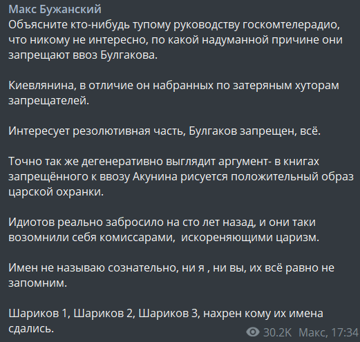 "Объясните кто-нибудь тупому руководству госкомтелерадио, что никому не интересно, по какой надуманной причине они запрещают ввоз Булгакова.