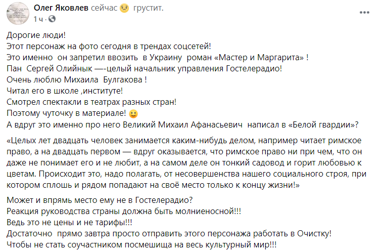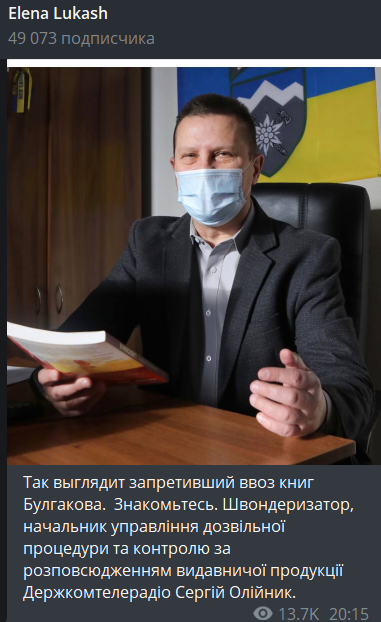 "В предисловии к книге Михаила Булгакова "Мастер и Маргарита" упоминаются представители российского кино, которые за публичную поддержку военной интервенции в Украине внесены в Перечень лиц, которые создают угрозу национальной безопасности", - пояснил Олейник.