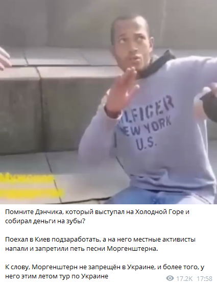 "Помните Дэнчика, который выступал на Холодной горе и собирал деньги на зубы? Поехал в Киев подзаработать, а на него местные активисты напали и запретили петь песни Моргенштерна...", - говорится в сообщении.