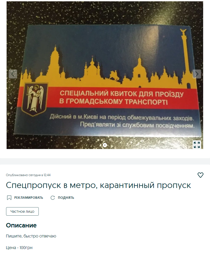 14:02 На сайте OLX.ua периодически появляются объявления о покупке-продаже спецпропусков на период карантина. Стоимость 100 грн.