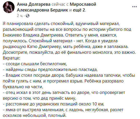 О том же пишет и российская журналистка и поэтесса Анна Долгарева, которая сейчас находится на Донбассе. Она опубликовала в Фейсбуке видеосюжет о трагедии и привела его краткое резюме:
