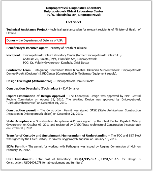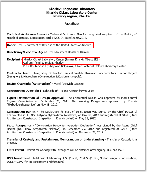 Также журналисты опубликовали документы, по которым Пентагон финансировал лаборатории в Харькове и Днепропетровске (бывшие областные СЭС). Одна из которых получила полтора, вторая – два миллиона долларов с 2010 по 2012 годы.