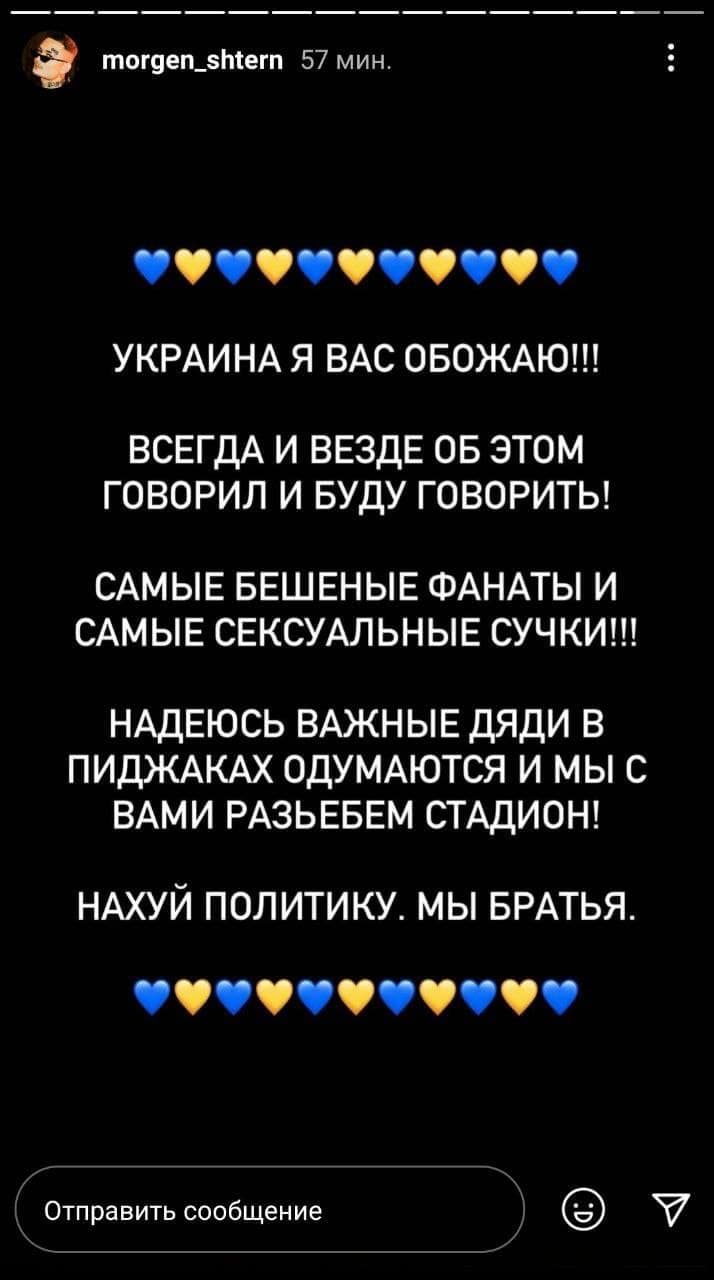 "Украина, я вас обожаю!!! Всегда и везде об этом говорил и буду говорить! Самые бешеные фанаты и самые сексуальные с@чки!!! Надеюсь, важные дяди в пиджаках одумаются, и мы с вами разъ@бем стадион. На@уй политику. Мы братья", – написал рэпер.