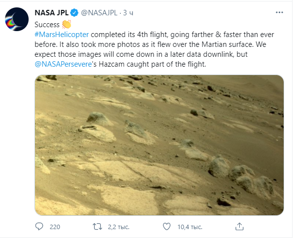 "Марсианский вертолет осуществил четвертый полет, переместившись с большей скоростью и на большую дистанцию, чем ранее", - сообщили ученые