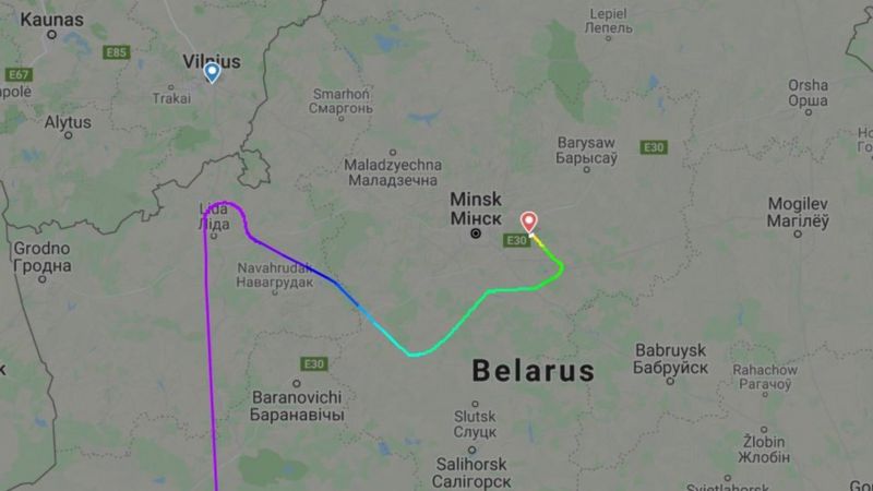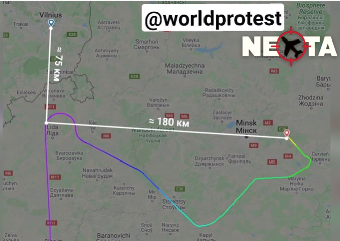 Изменение курса. Вебсайт Flightradar124 зарегистрировал отклонение рейса FR4978 от намеченного маршрута незадолго до того, как самолет достиг литовской границы. Рейс развернуло на юго-восток в сторону Минска.