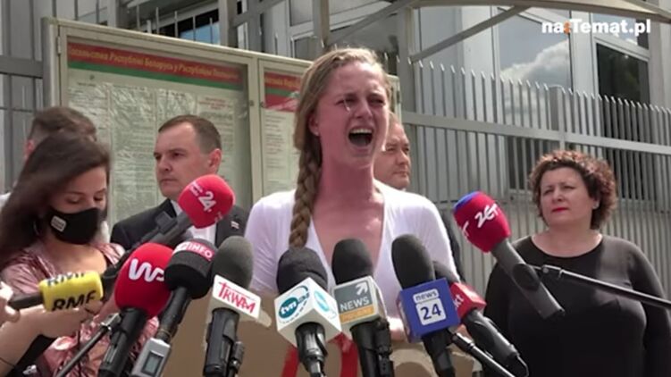 В связи с задержанием в Минске основателя Telegram-канала Nexta Романа Протасевича белорусские активисты устроили акцию протеста перед посольством республики в Варшаве. На ней одна из единомышленниц Протасевича Яна Шостак поддержала оппозиционера, надрывно крича в микрофоны окруживших ее журналистов в течение минуты.