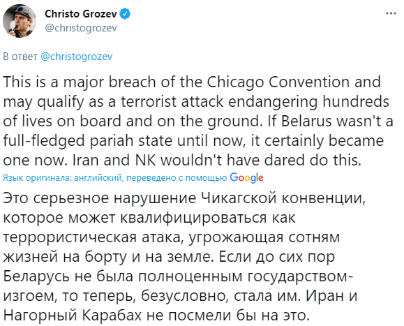 "Это является серьезным нарушением Чикагской конвенции и может квалифицироваться как террористическое нападение, что поставило под угрозу сотни жизней на борту и на земле. Если до сих пор Беларусь не была полноценным государством-изгоем, то сейчас она, безусловно, стала государством-изгоем. Иран и Северная Корея не осмелились бы сделать это", - прокомментировал он в Твиттер.