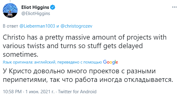 Также он пишет, что Христо Грозев очень занят другими проектами, поэтому приходится откладывать тему с "вагнеровцами" .
