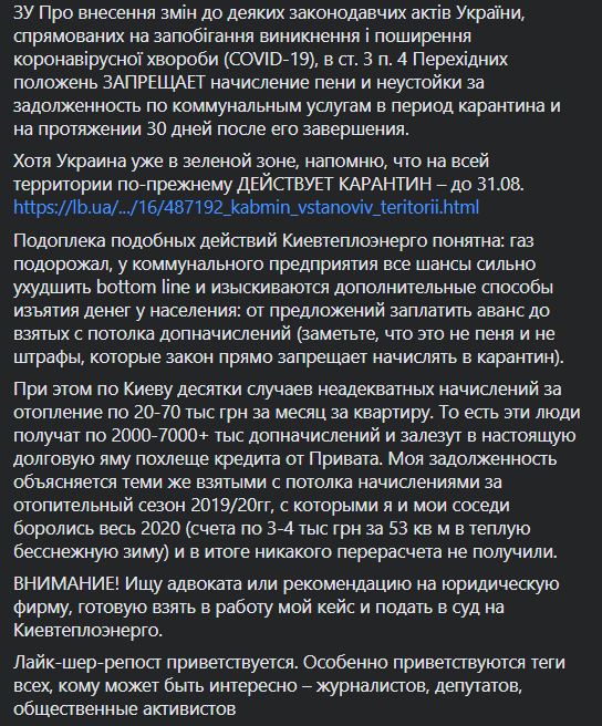 "По Киеву десятки случаев неадекватных начислений за отопление по 20-70 тыс грн за месяц за квартиру. То есть эти люди получат по 2000-7000+ тыс допначислений и залезут в настоящую долговую яму похлеще кредита от Привата. Моя задолженность объясняется теми же взятыми с потолка начислениями за отопительный сезон 2019/20гг, с которыми я и мои соседи боролись весь 2020-й (счета по 3-4 тыс грн за 53 кв м в теплую бесснежную зиму) и в итоге никакого перерасчета не получили", - пишет она.