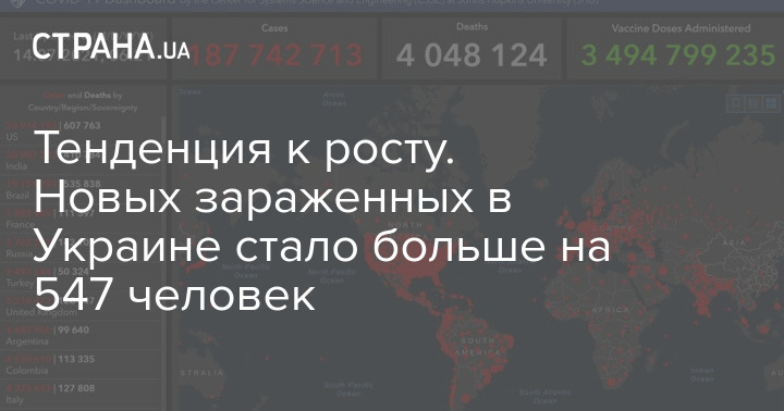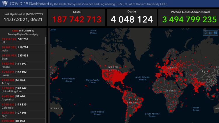 По данным на 14 июля, общее число зараженных на Земле приближается к 188 миллионам, фото: университет Дж. Хопкинса