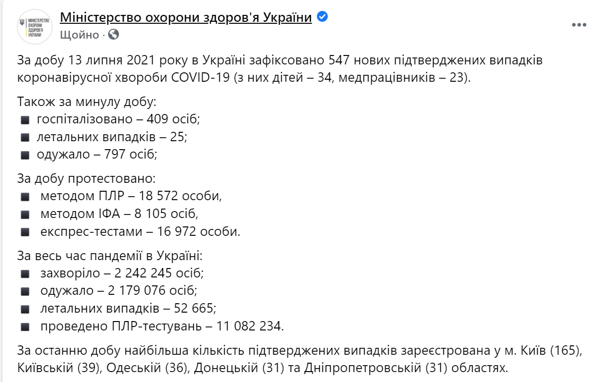 По состоянию на утро среды, 14 июля, общее количество зараженных коронавирусом в Украине с начала эпидемии выросло еще на 547 человек.