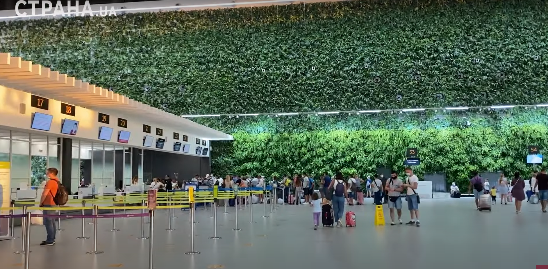 В самом аэропорту на стойках регистрации мы увидели оригинально оформленный дизайн стены - он похож на зеленый ковер.