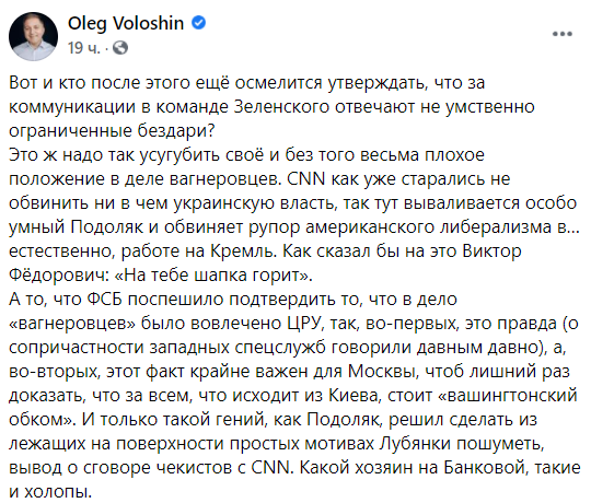 Это ж надо так усугубить своё и без того весьма плохое положение в деле вагнеровцев. CNN как уже старались не обвинить ни в чем украинскую власть, так тут вываливается особо умный Подоляк и обвиняет рупор американского либерализма в… естественно, работе на Кремль. Как сказал бы на это Виктор Фёдорович: "На тебе шапка горит".