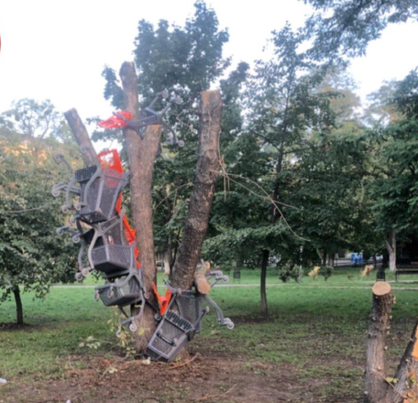 В Киеве неизвестные каждую ночь обвешивают стволы спиленных деревьев тележками из супермаркета. При этом дворник каждое утро снимает эти сомнительные украшения, но следующей ночью они снова появляются.