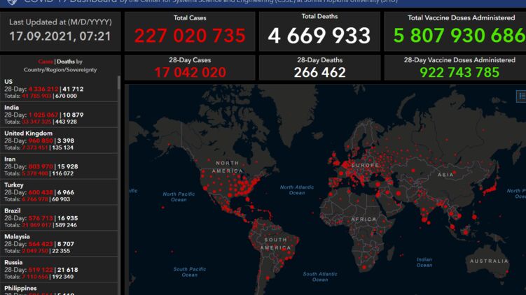 В целом на планете, по данным университета Джона Хопкинса на утро 17 сентября, число зараженных достигло отметки в 227 020 735 человек.