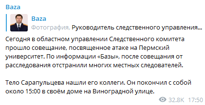 Известно, что перед своей гибелью Сарапульцев участвовал в совещании с руководством, на котором речь шла о стрельбе в Пермском университете, в результате которой 18-летний студент застрелил шестерых человек и ранил несколько десятков людей. По слухам, после этого совещания от расследования отстранили многих местных следователей, сообщает Телеграм-канала Baza.