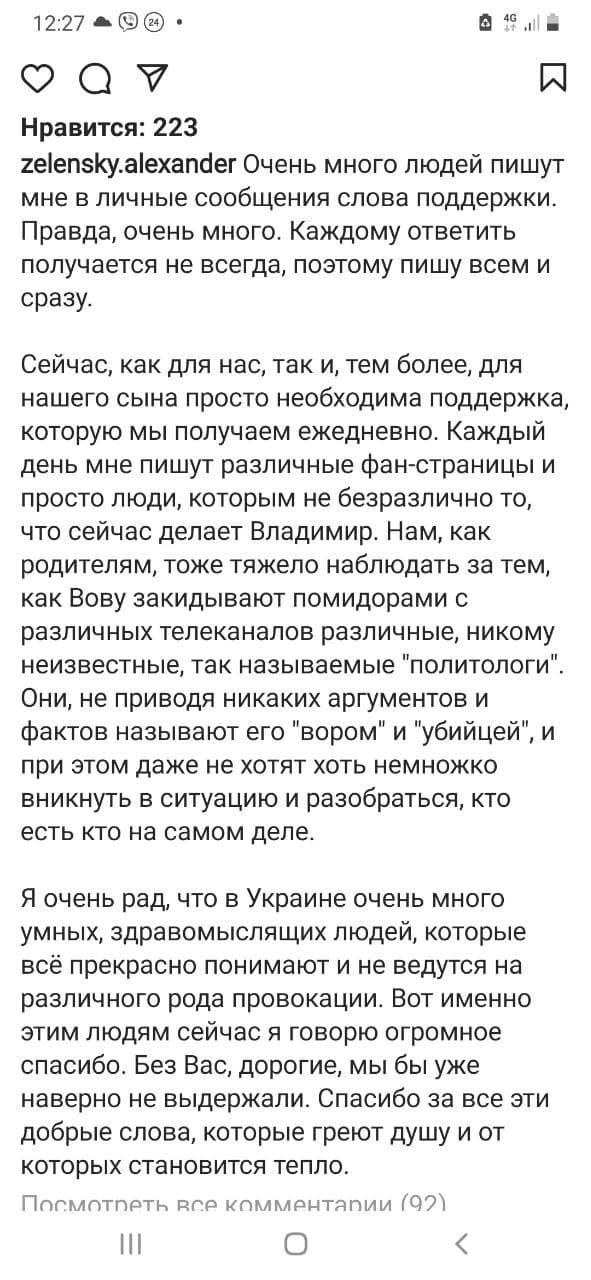 "Они, не приводя никаких аргументов и фактов называют его "вором" и "убийцей", и при этом даже не хотят хоть немножко вникнуть в ситуацию и разобраться, кто есть кто на самом деле", - пишет Зеленский-старший.