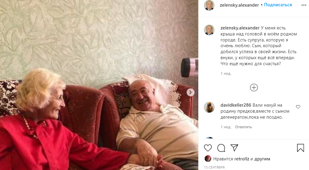 "У меня есть крыша над головой в моем родном городе. Есть супруга, которую я очень люблю. Сын, который добился успеха в своей жизни. Есть внуки, у которых еще все впереди. Что еще нужно для счастья?" - написал Александр Зеленский.