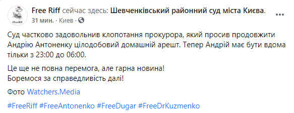 Фигуранту дела об убийстве журналиста Павла Шеремета музыканту и ветерану АТО Андрею Антоненко смягчили меру пресечения. Шевченковский районный суд Киева частично удовлетворил ходатайство прокурора, который просил продлить Антоненко круглосуточный домашний арест. Теперь подсудимый должен находиться дома только с 23:00 до 06:00. Об этом сообщается на странице Free Riff в соцсети.
