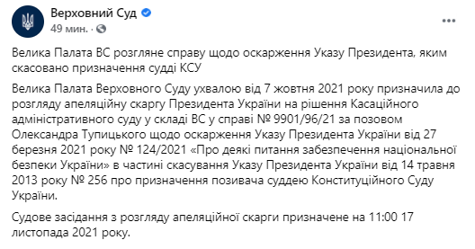 "Большая палата Верховного суда постановлением от 7 октября 2021г. назначила к рассмотрению апелляционную жалобу президента Украины на решение Кассационного административного суда в составе ВС по делу №9901/96/21 по иску Александра Тупицкого по обжалованию указа президента Украины от 27 марта 2021г. №124/2021 "О некоторых вопросах обеспечения национальной безопасности Украины" в части отмены указа президента Украины от 14 мая 2013г. №256 о назначении истца судьей Конституционного суда Украины", - говорится в сообщении.
