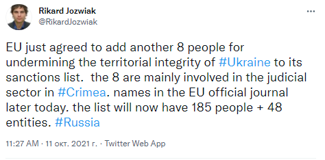 "ЕС только что согласился добавить еще 8 человек за подрыв территориальной целостности Украины в свой список санкций. Все они в основном работают в судебном секторе Крыма. Имена в официальном журнале ЕС позже сегодня. Теперь в списке будет 185 человек + 48 организаций", - написал журналист.