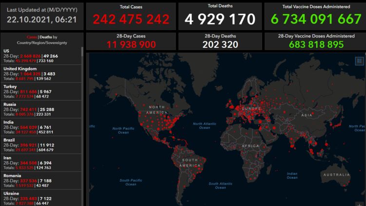 По данным на утро 22 октября, общее число зараженных на планете приближается к отметке в 243 миллиона, фото: arcgis.com