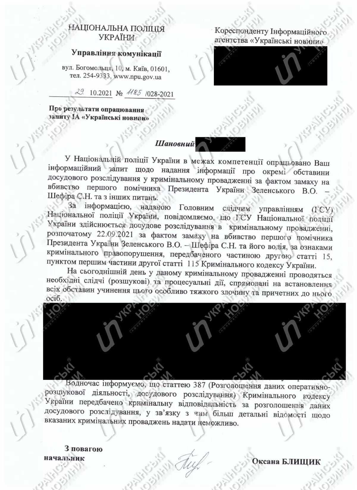 Национальная полиция засекретила данные о досудебном расследовании по делу о покушении на первого помощника президента Украины Владимира Зеленского Сергея Шефира.