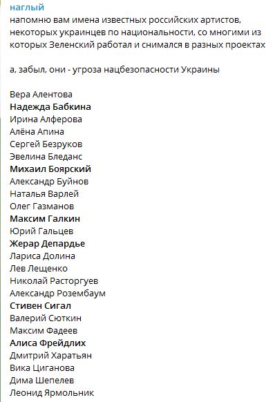 "Напомню вам имена известных российских артистов, некоторых украинцев по национальности, со многими из которых Зеленский работал и снимался в разных проектах.
