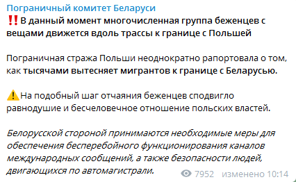 В Пограничном комитете Беларуси подтвердили движение мигрантов и заявили, что "на подобный шаг отчаяния беженцев сподвигло равнодушие и бесчеловечное отношение польских властей", поскольку польские  пограничники ранее тысячами вытесняли мигрантов к границе с Беларусью.