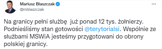 "На границе несут службу уже более 12 тыс. солдат. Мы повысили уровень готовности войск территориальной обороны. Вместе со службами МВД мы готовы к обороне польской границы", - написал в Twitter министр национальной обороны Польши Мариуш Блащак.