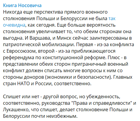 "Никогда еще перспектива прямого военного столкновения Польши и Белоруссии не была так очевидна, как сегодня. Еще больше вероятность столкновения увеличивает то, что обеим сторонам она выгодна. И Варшава, и Минск сейчас заинтересованы в патриотической мобилизации. Первая - из-за конфликта с Евросоюзом, второй - из-за приближающегося референдума по конституционной реформе (он пройдет в Беларуси в феврале и должен ограничить власть президента - Ред.).