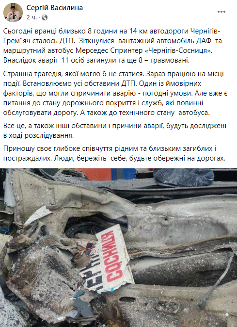 Приношу свое глубокое соболезнование родным и близким погибших и пострадавших. Люди, берегите себя, будьте осторожны на дорогах", - написал Сергей Василина у себя в Facebook.