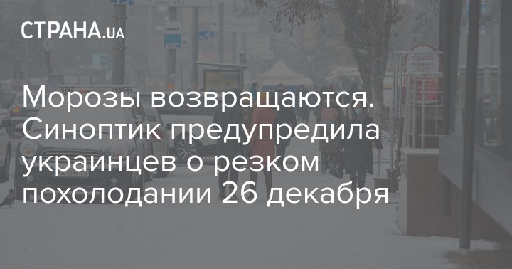 В воскресенье, 26 декабря, в Украину придет резкое похолодание, на улице ожидаются мороз и гололед. Об этом рассказала синоптик Наталья Диденко у себя в Facebook.