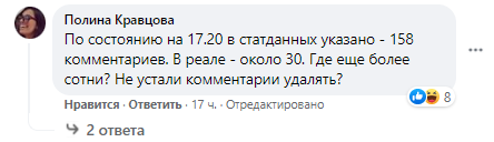 "По состоянию на 17:20 [1 января] в статданных указано — 158 комментариев. В реале — около 30. Где еще более сотни? Не устали комментарии удалять?" — пишет Полина Кравцова.