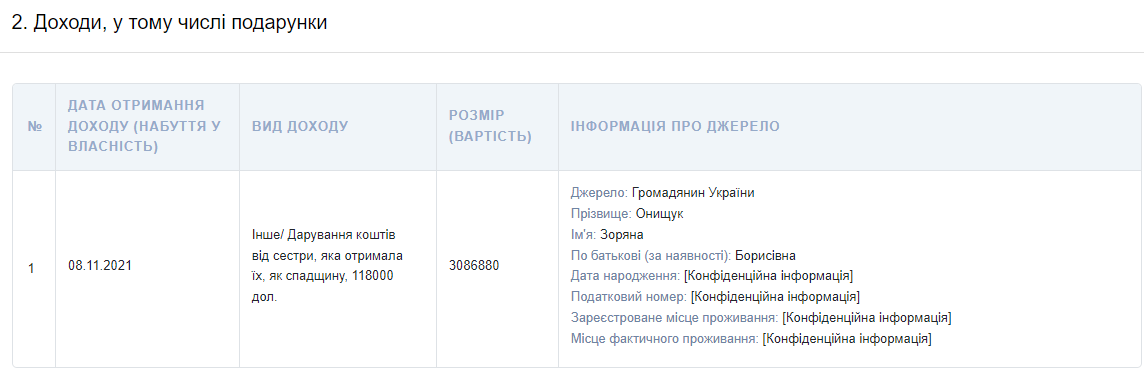 8 ноября 2021 года сестра подарила Хомчаку 118 тыс. долларов или свыше 3 млн грн. Свой доход Хомчак задекларировал в графе "Подарки" как дарение средств от сестры Зоряны Онищук, которая получила их как наследство.