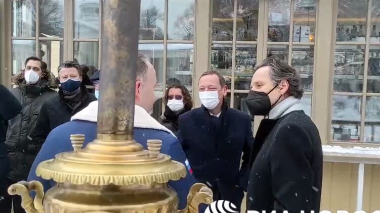 На кадрах видно, что перед встречей в Москве французского и немецкого советников Эммануэля Бонна и Йенса Плетнера покатали на "русской тройке" и угостили чаем из самовара.