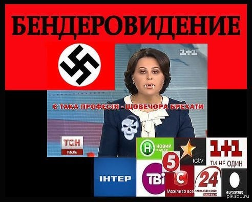 На ней изображена картинка с нацистской свастикой, надписями "бендеровидение "и "есть такая профессия, каждый вечер врать", телеведущей телеканала "1+1" Натальей Мосейчук и логотипы национальных телевизионных вещателей.